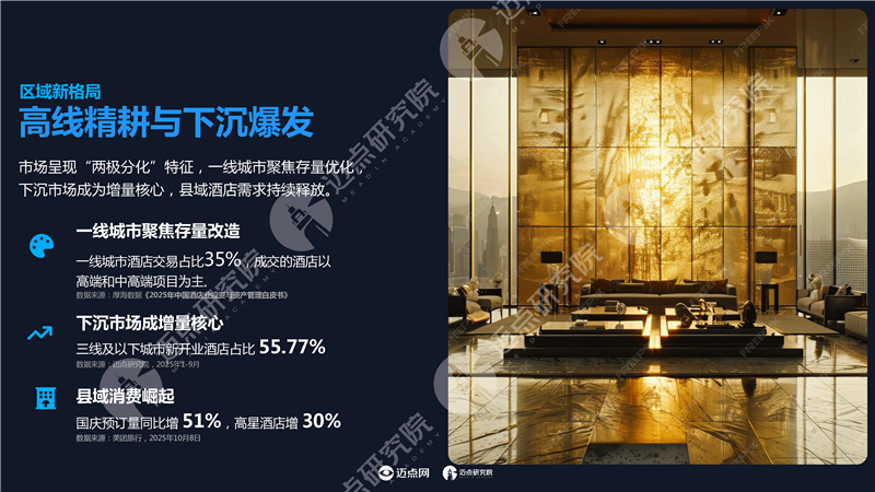 区域格局方面,市场呈现“两极分化”的鲜明特征。一线城市聚焦存量优化。《2025年中国酒店业投资与资产管理白皮书》显示,2020-2025年关键酒店资产交易城市占比中,一线城市酒店交易占比35%,而关键成交的酒店资产类型以高端和中高端项目为主。随着下沉市场需求的逐渐释放,三线及以下城市表现更为亮眼。迈点研究院数据显示,2025年1-9月,三线及以下城市新开业品牌酒店数量占比高达55.77%。