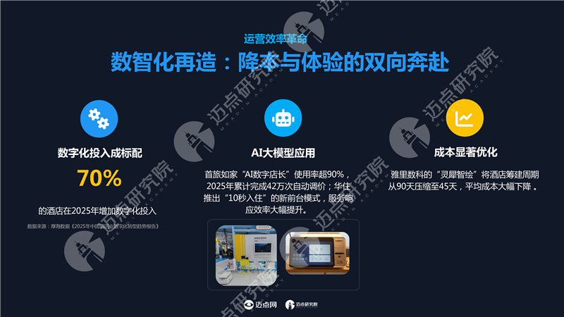 数智化运营已成为行业标配,从基础服务智能化向全流程效率优化延伸,大模型等技术加速落地。首先看投入意愿,《2025年中国酒店业数字化转型趋势报告》显示,67.3%的酒店在2025年增加数字化投入,数智化不再是“可选项”,而是“必选项”。效率提升方面,头部企业率先突破:华住推出“10秒入住”新前台模式,通过自助机与移动Pad配合,将传统10分钟的入住流程压缩至秒级,大幅减少客人排队时间。成本优化效果同样显著,雅里数科的“灵犀智绘”将酒店筹建周期从90天压缩至45天,平均成本大幅下降。数智化正在成为酒店“降本增效”的核心抓手。