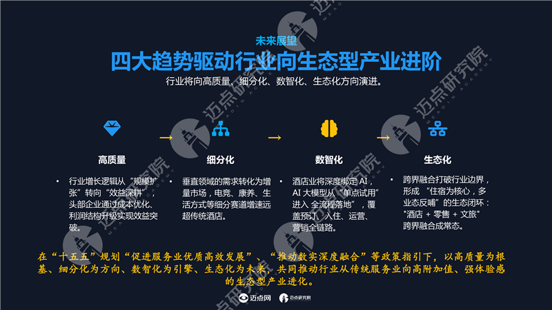 在“十五五”规划“促进服务业优质高效发展”、“推动数实深度融合”等政策指引下,未来酒店行业将以高质量为根基、细分化为方向、数智化为引擎、生态化为未来,共同推动行业从传统服务业向高附加值、强体验感的生态型产业进化。