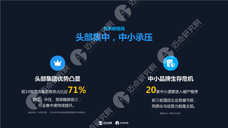 竞争态势层面,头部集团凭借规模优势加速整合,中小酒管公司则陷入生存危机。据迈点研究院发布的《2024年度中国酒店集团规模TOP60榜单》显示,2025年前10强酒店集团客房数占比近60%,锦江、华住、首旅稳居国内前三,头部效应愈发明显。与之相对的是中小酒管的困境:2025年初近20家中小酒管进入破产程序,新三板酒店企业更是普遍亏损。这种“强者愈强、弱者愈弱”马太效应,还将在未来一段时间持续。