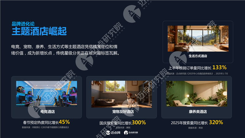 细分赛道中,主题酒店成为新的增长亮点,电竞、宠物友好、康养、生活方式等品类表现突出。同程旅行《2025春节假期旅行消费报告》显示,电竞酒店春节预定热度同比增长45%,凭借“专业设备+社交场景”吸引年轻客群;此外,携程数据显示,国庆期间,宠物友好酒店搜索量同比增长300%,越来越多酒店推出“宠物专属客房”、“宠物托管”服务,满足养宠人群出行需求;美团数据显示,康养类酒店2025年搜索量同比增长320%,针对银发群体与亚健康人群,提供理疗、养生餐等服务,契合健康消费趋势;生活方式酒店同样势头良好,抖音生活服务数据显示其上半年核销订单量同比增长133%。主题酒店的爆发,印证了行业从“同质化竞争”向“差异化突围”的转型趋势。
