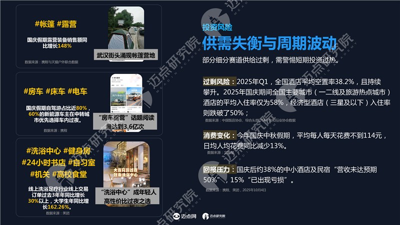 在关注投资热点的同时,也需警惕潜在风险,主要集中在供需失衡、消费变化与回报压力三方面。据中国饭店协会数据,2025年第一季度,全国酒店平均空置率38.2%,且持续攀升。综合头部OTA平台和行业协会数据,2025年国庆期间全国主要城市(一二线及旅游热点城市)酒店的平均入住率仅为58%,经济型酒店(三星及以下)入住率则跌破了50%。此外,据文旅部数据测算,今年国庆中秋假期,平均每人每天花费不到114元,日均人均花费同比减少13%。回报压力持续存在,据携程、美团数据,国庆后约38%的中小酒店及民宿“营收未达预期50%”,15%“已出现亏损”。投资者需做好精细化成本测算,避免陷入“高投入、低回报”陷阱。