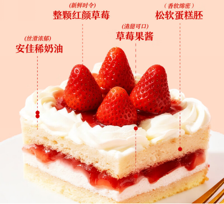 更重要的是,七鲜对配方进行了健康化调整,整体含糖量降低25%。通过熬制低糖草莓酱,并调整奶油与蛋糕胚的糖分比例,实现“减糖不减味”,精准契合当下消费者对“甜而不腻”的追求。