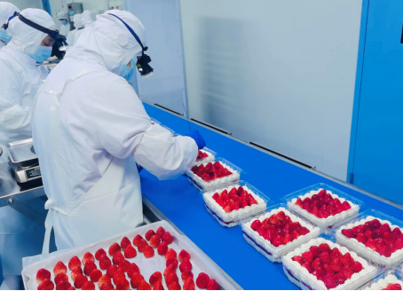 草莓的新鲜度和口感始终是整个蛋糕的“灵魂”。为确保每一颗草莓都达到最佳状态,七鲜设置了严苛的“筛选关卡”:从颜色、规格到糖度均有明确标准,只有达到10成熟、果形完整的锥形草莓才能入选。车间配备测糖仪,并在清洗、去蒂、组装环节多次人工检查,甚至在盖盒前使用探照灯做最终确认,确保品相统一、无瑕疵留存。进入门店上架前,店员还会进行最终的检查与确认。