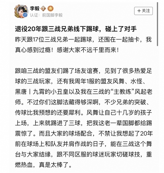 从李毅本人赛后的感慨也不难看出,从绿茵场跨界到游戏里的三国策略战场,他很享受这个可以挥洒热血的新舞台,同时也很珍惜和这群玩家兄弟并肩拼搏的日子。