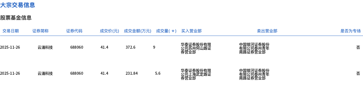 11月26日,云涌科技大宗交易成交14.6万股,成交额604.44万元,占当日总成交额的19.71%,成交价41.4元,较市场收盘价45.72元折价9.45%。