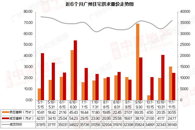 据广州中原研究中心统计,11月上半月广州新房市场累计网签24.77万㎡,对比10月上半月上升18%。受从化、南沙、白云部分积压项目集中网签刺激,新房网签表现创7月以来新高。此外,保利翡丽甲第等中心区项目首开井陆续网签,带动11月上旬网签均价提高。
