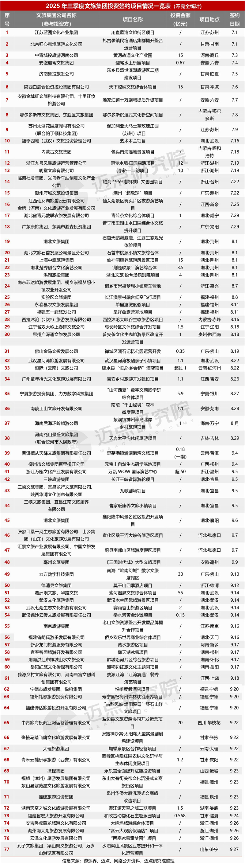 2025年前三季度,宏观经济平稳运行、旅游经济繁荣发展支撑文旅投资持续向好。全国代表性文旅集团投资表现积极活跃:据迈点研究院不完全统计,前三季度累计投资签约各类文旅项目约200个,投资金额超1200亿元;以携程、同程旅行、中旅国际等头部集团为代表,通过收并购等方式整合优质资源,战略收购、战略重组、注资增资等事件频发,头部企业带动下重资产投资回暖。融资端,资本市场对文旅行业的关注热度持续提升,据不完全统计,前三季度代表性文旅集团融资金额累计约1300亿元,为优质项目落地、业态创新及产业链整合注入强劲动力。