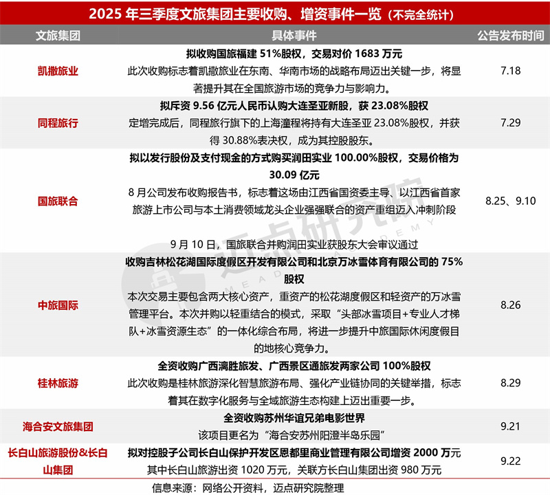 2025年三季度文旅集团收购与增资事件频发,全产业链布局提速:具体涵盖传统旅行社、在线旅游、文旅实业、冰雪度假、智慧旅游、主题乐园、商业服务等领域,企业通过收购增资横向拓业务场景,纵向延伸产业链,如凯撒旅业在东南与华南布局旅行社、同程旅行收购大连圣亚即布局线下资产、中旅国际整合冰雪与度假资源等。即各集团通过资本运作助力企业快速扩张,加速资源优化,提升行业集中度。