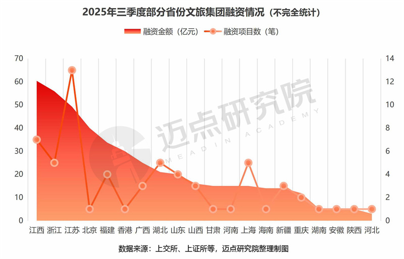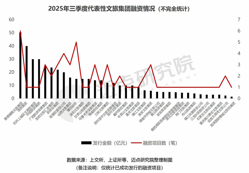 据迈点研究院不完全统计,2025年三季度共有35个文旅集团发起并完成融资项目事项,其中,景德镇陶文旅集团融资金额和融资项目数量均居首位(50.39亿元、6笔),体现了资本市场对其文旅资源整合能力、项目运营水平及长期发展潜力的高度认可。