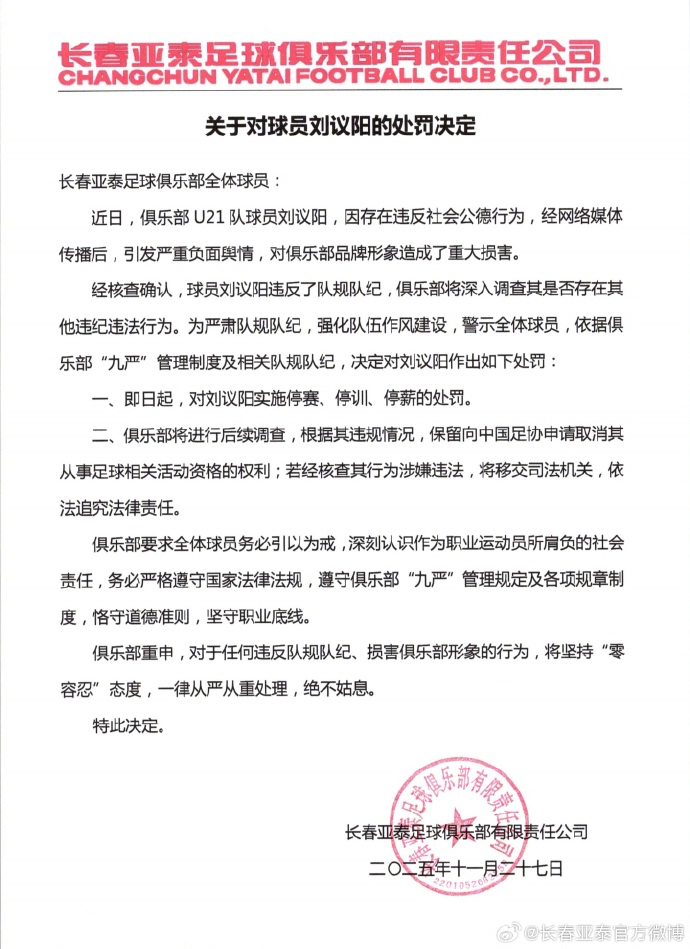 11月27日,长春亚泰官方发布公告称,俱乐部U21队球员刘议阳,因存在违反社会公德行为,经网络媒体传播后,引发严重负面舆情,对俱乐部品牌形象造成了重大损害,决定对刘议阳实施停赛、停训、停薪的处罚。