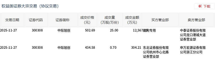 11月27日,中际旭创大宗交易成交25.7万股,成交额1.29亿元,占当日总成交额的0.54%,成交均价500.84元,较市场收盘价524元折价4.42%,其中最高成交价502.69元,最低成交价434.58元。