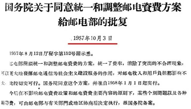 第一次,1958年10月3日,国务院下发“关于同意统一和调整邮电资费方案给邮电部的批复”,主要下调的资费包括: