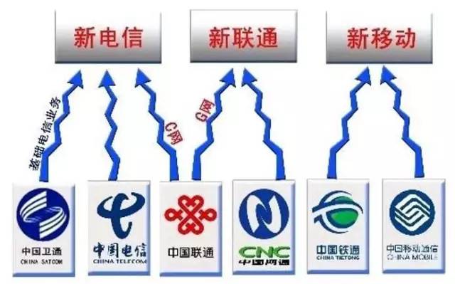 第三次重组,全业务竞争全面爆发。2008年7月29日,中国电信集团宣布未来三年投资800亿元发展CDMA业务(包括资产和用户),同时将中国卫通的基础电信业务并入;中国联通与中国网通合并;中国铁通并入中国移动。这次重组也形成了目前中国移动、中国电信、中国联通三国鼎立的局面,全业务竞争的格局正式形成。
