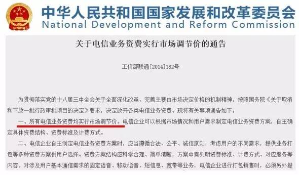 政府后退一步,定价权利交还市场。2014年5月10日,国家发改委与工业与信息化部,联合发布《关于电信业务资费实行市场调节价的通告》。明确要求:为贯彻落实党的十八届三中全会关于全面深化改革、完善主要由市场决定价格的机制精神,所有电信业务资费均实行市场调节价。