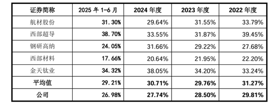 招股书显示,2022年及2025年前6个月,有研复材的主营业务毛利率分别为26.93%、27.45%、25.97%、24.93%,其中,双金属复合材料及制品的毛利率逐年下降,毛利率出现波动。
