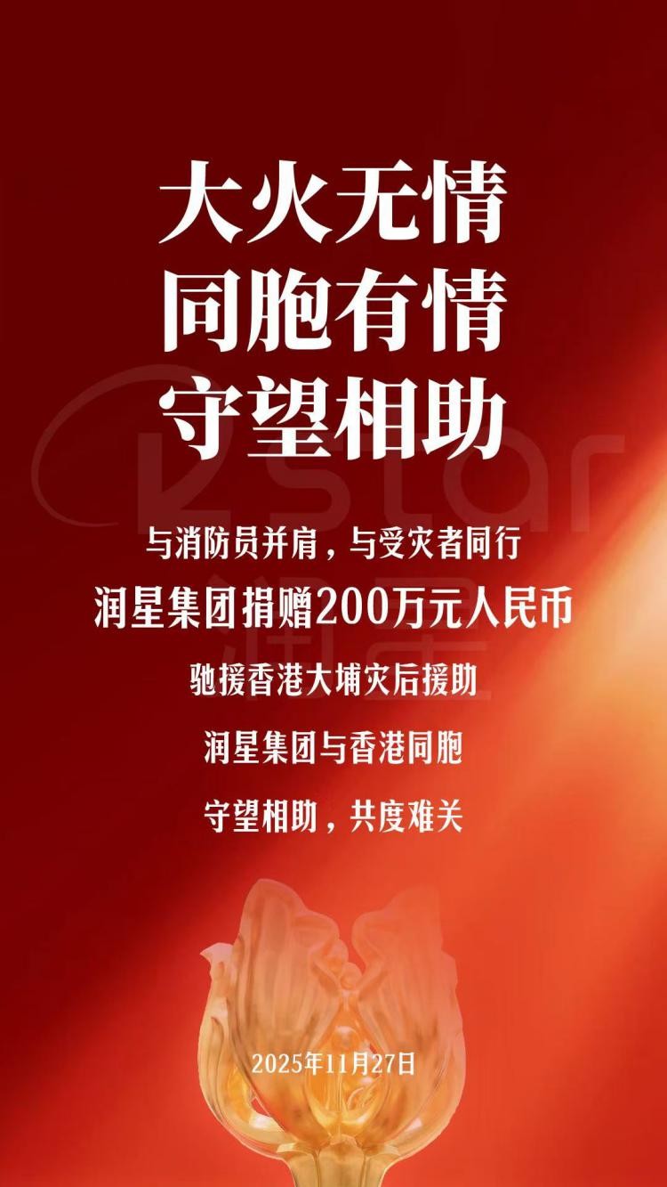 11月26日下午,香港新界大埔宏福苑多栋住宅楼发生火灾,造成重大人员伤亡和财产损失,令人痛心。为响应紧急需求,协助受灾同胞渡过难关,润星集团11月27日宣布,通过中国红十字会总会捐赠200万元人民币,用于支持受灾地区的紧急救援、物资采购、灾民安置及心理辅导等专项工作。
