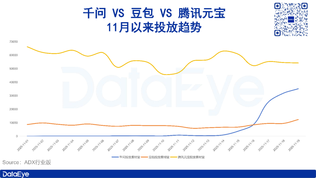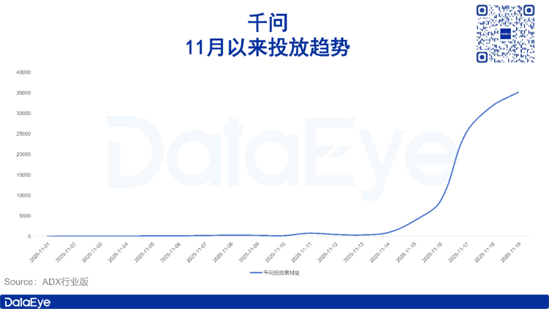 ADX行业版数据显示,11月以来千问(及前身通义APP)投放力度呈前期低迷、后期爆发状态。11月13日及之前,通义APP投放力度几乎停滞,日投放素材量仅有几十至上百组;11月14日,通义升级为千问APP,投放素材量随之上涨至890组,并在之后爆发式上涨,至今,日投放素材量已达3.5万组。