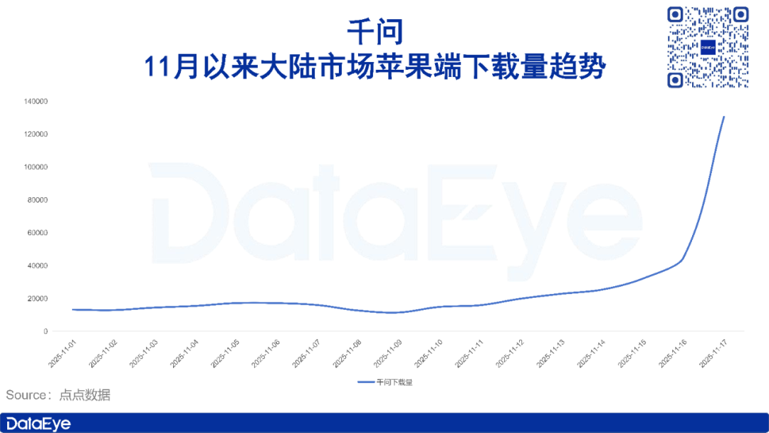 点点数据显示,11月初期,千问前身通义APP下载量始终保持在较低水平,日下载量约1.5万次,11月14日左右有一定程度提升,至11月16日,日下载量达4.5万次左右;11月17日,千问下载量暴涨至13万次。