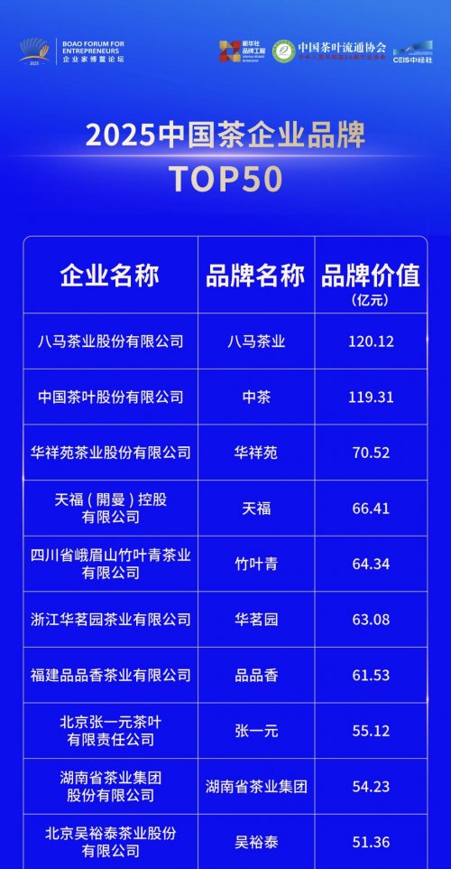 2025中国茶企业品牌调查结果榜单,八马茶业位列第一