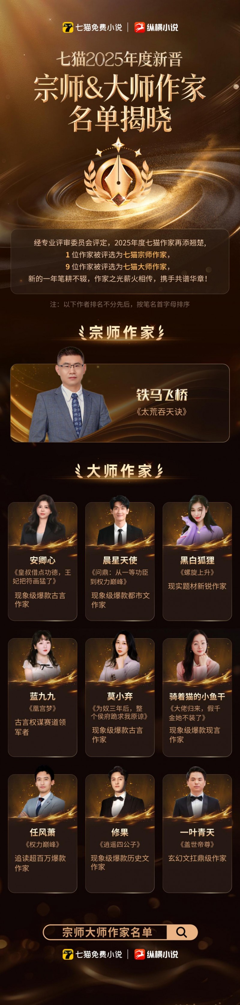 2025年11月28日,七猫2025年度新晋宗师、大师作家名单重磅揭晓!