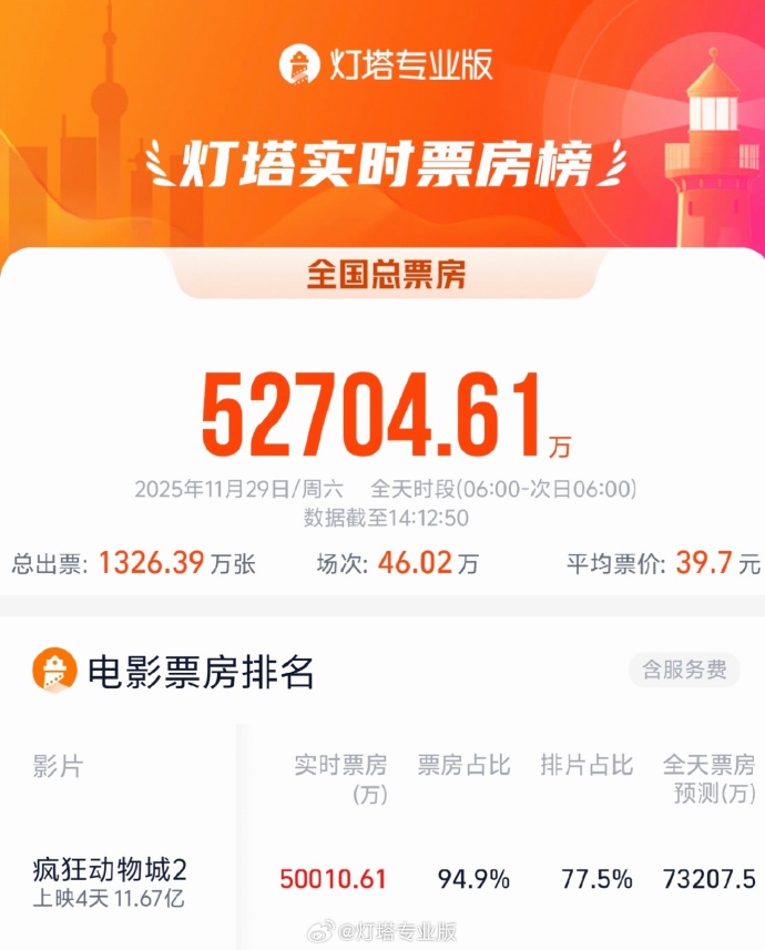 11月29日,据灯塔专业版,截至14时12分,《疯狂动物城2》单日票房已突破5亿。