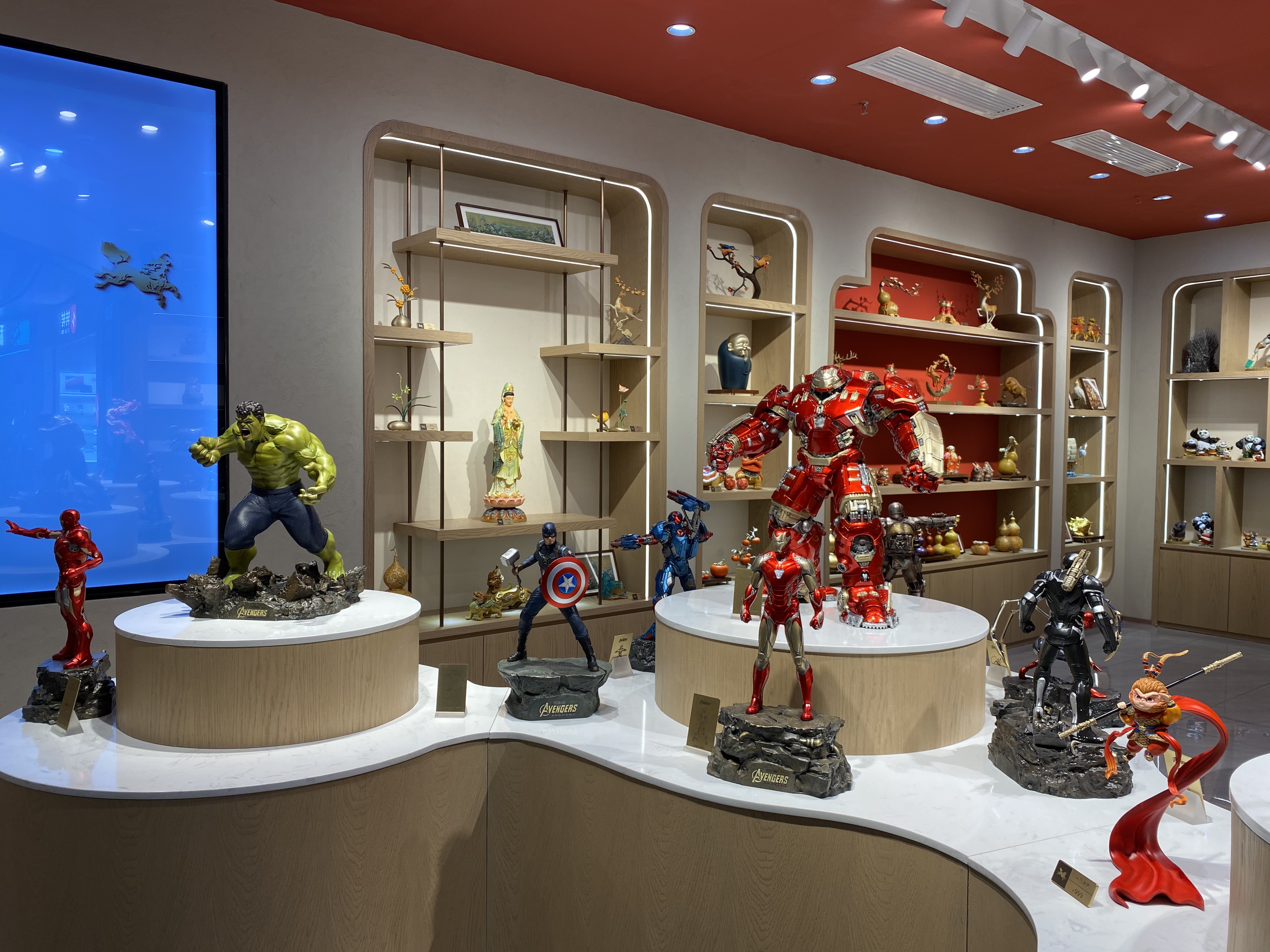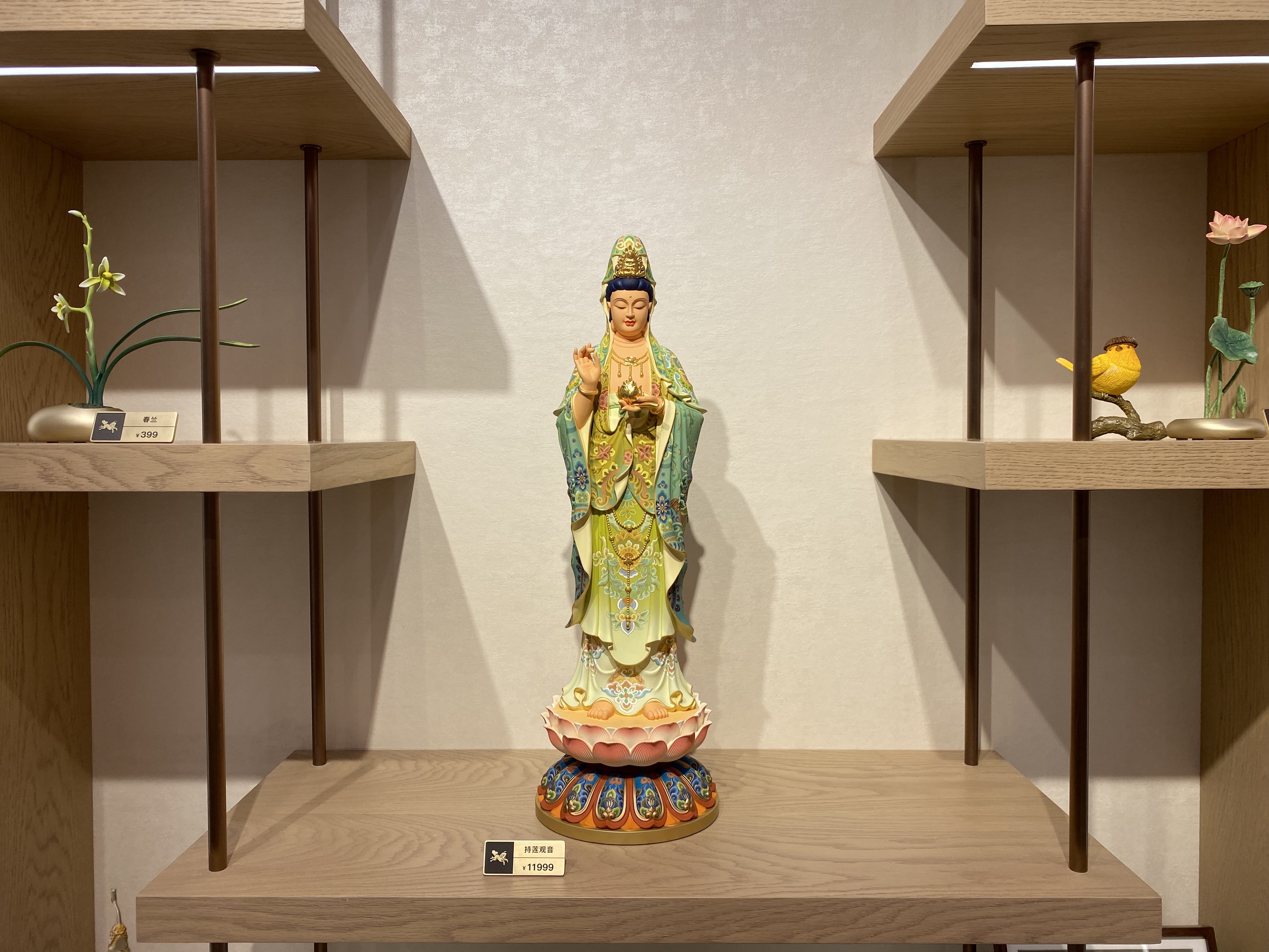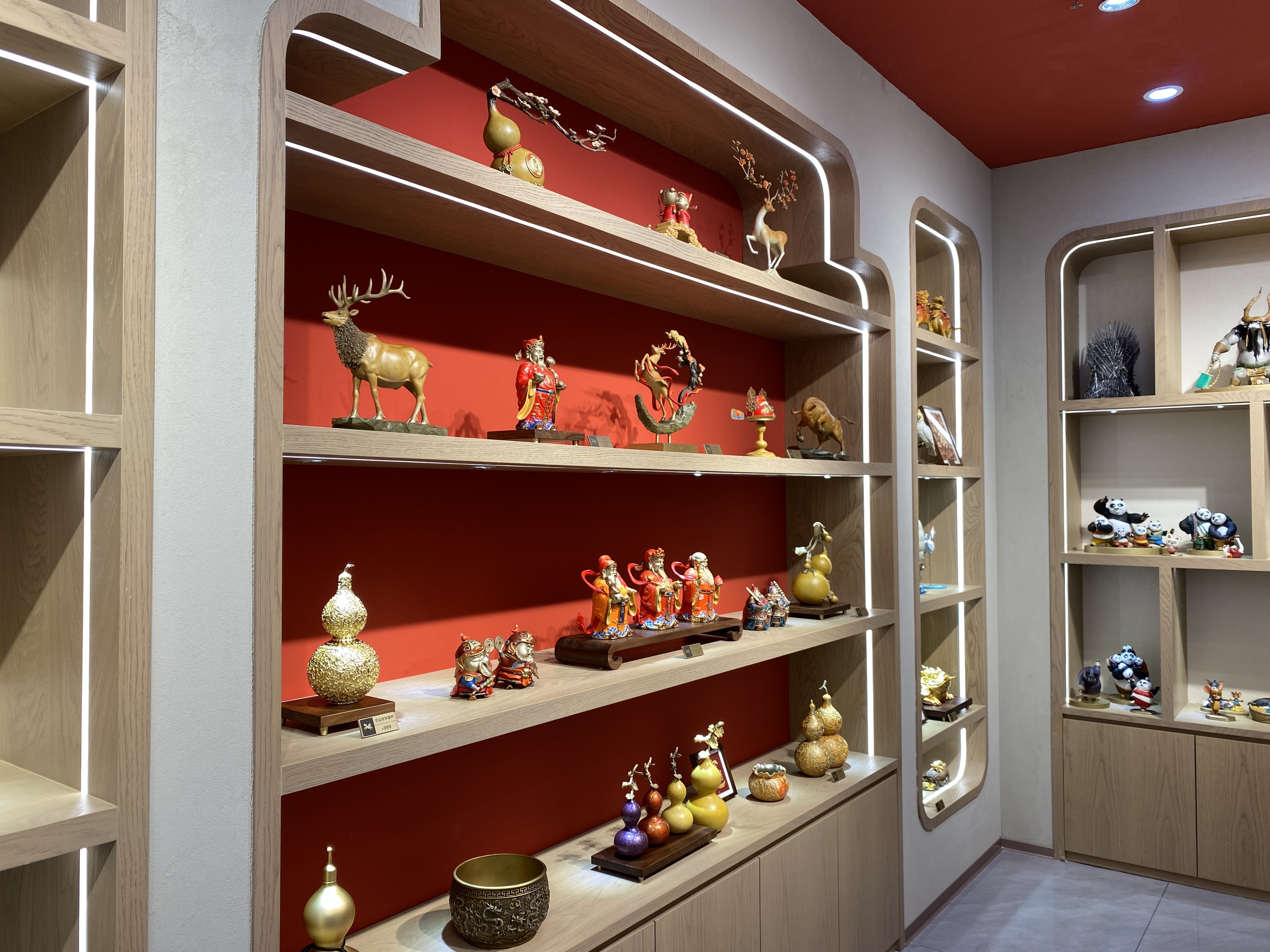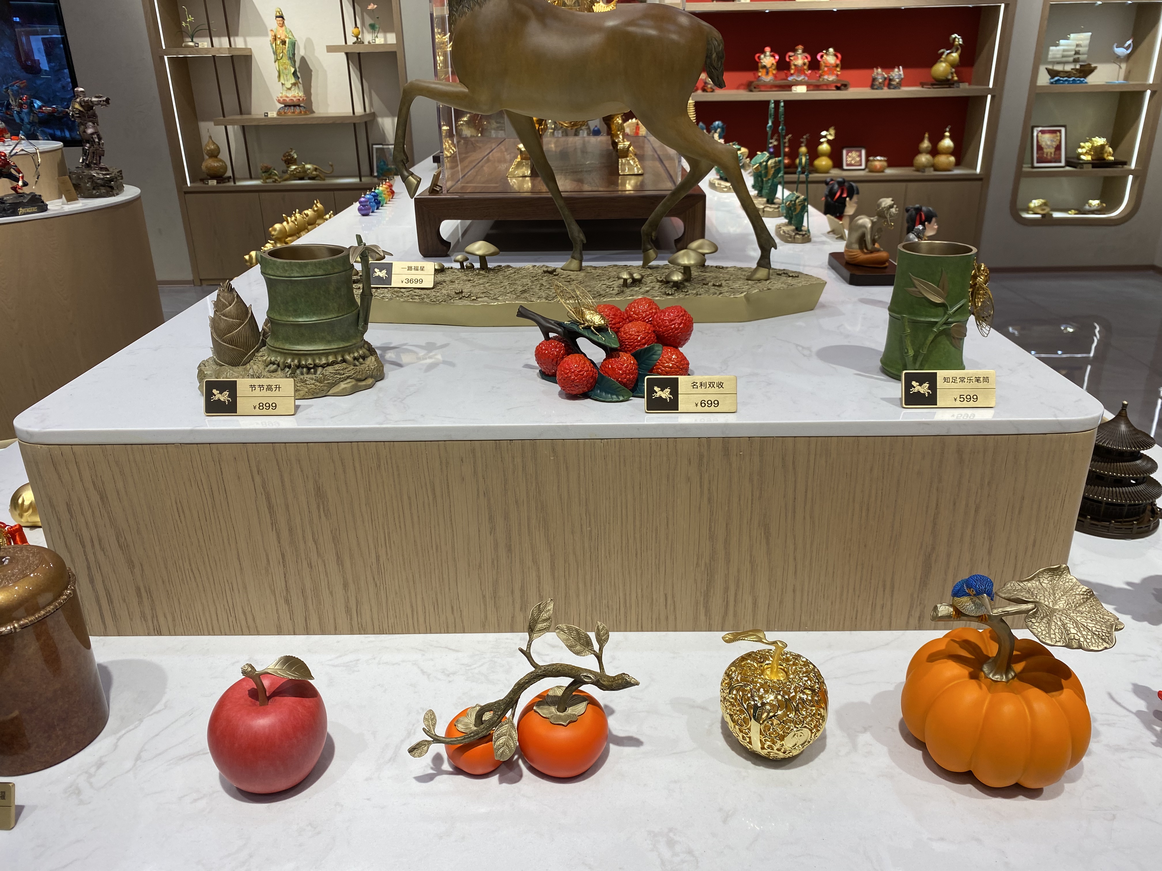 界面新闻记者走访了铜师傅11月中旬在深圳开出的首家直营门店,发现店内大部分产品以蕴含美好寓意或有历史文化内涵的设计元素为主;且价格带跨度大,从几十元的小摆件到上万元的观音雕塑皆有陈列。店员向记者介绍,如财神、“牛柿”、葫芦造型的摆件卖得相对较好,到店消费的顾客多为中年人,大部分是有送礼需求。