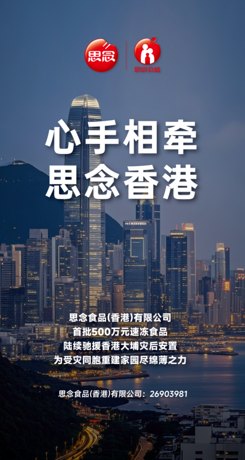 为积极响应灾后救援工作,11月29日,思念香港有限公司调配首批500万元速冻食品物资,陆续驰援香港大埔的灾后安置,为受灾同胞重建家园尽绵薄之力。