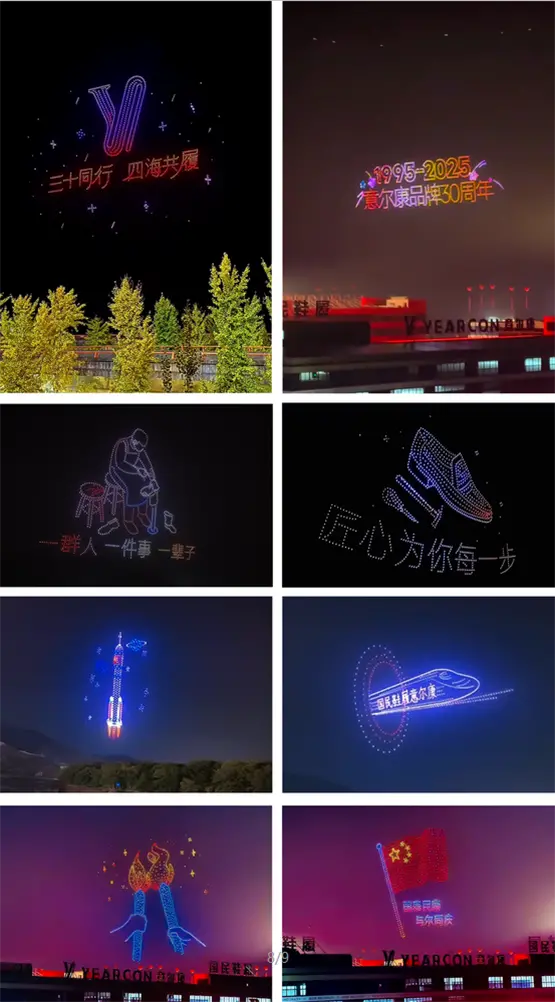 国泰民康,与尔同庆。压轴登场的大型无人机表演,以夜空为幕,绘就“国民鞋履”、“匠心为你每一步”“神六飞天”“意尔康号高铁”等震撼画面。每一帧璀璨光影,都是对意尔康人辛勤付出的崇高礼赞,更将“匠心传承”的信念深深烙印在每个人心中。