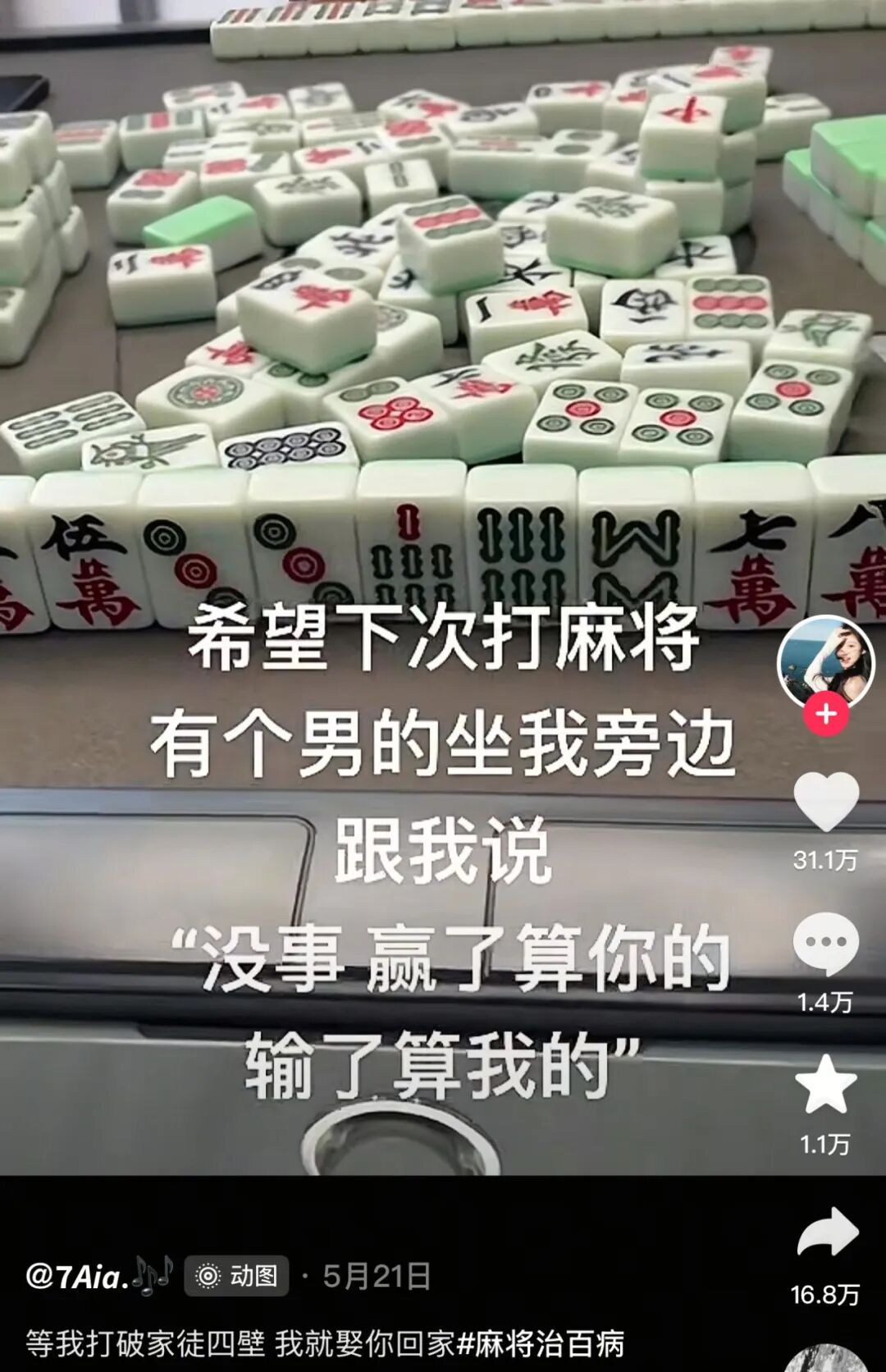 “等我打破家徒四壁就娶你”的文案普遍配着麻将桌图,则是一种对经典爱情模式的解构与犬儒主义。等我娶你当然可以,前提是下一把胡个大的。它既承认了物质基础在婚恋中的残酷且必要,又用一种戏谑认命的口吻消解其严肃性。