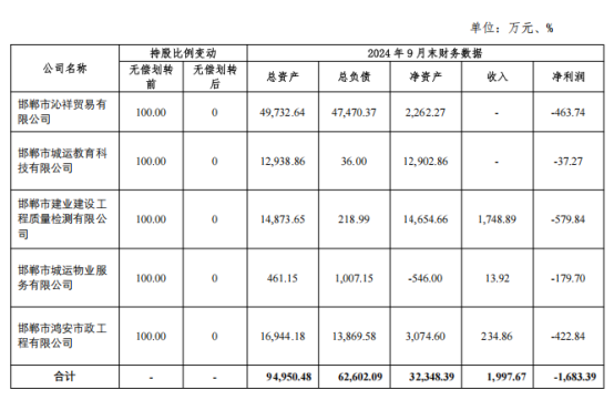 财务数据显示,以2024年9月末为核算节点,本次划转标的资产合计总资产达94,950.48万元,净资产32,348.39万元。划转完成后,邯郸城投对上述五家子公司的持股比例均从100%降至0%,相应导致公司净资产减少32,348.39万元,占当期净资产比例1.35%,未超过10%的重要阈值。从规模对比来看,标的资产规模占邯郸城投2023年末净资产的3.97%,营业收入占比1.38%,净利润占比为-14.78%。