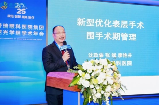 湖北普瑞眼科医院沈政伟教授的演讲课题为《新型优化表层手术围手术期管理》。沈政伟教授分享了新型优化表层手术的围术期管理经验,系统介绍了其改良的丁基橡胶酒精壶专利,重点阐述了覆盖术前至术后的全流程管理要点及配套的围术期用药方案。