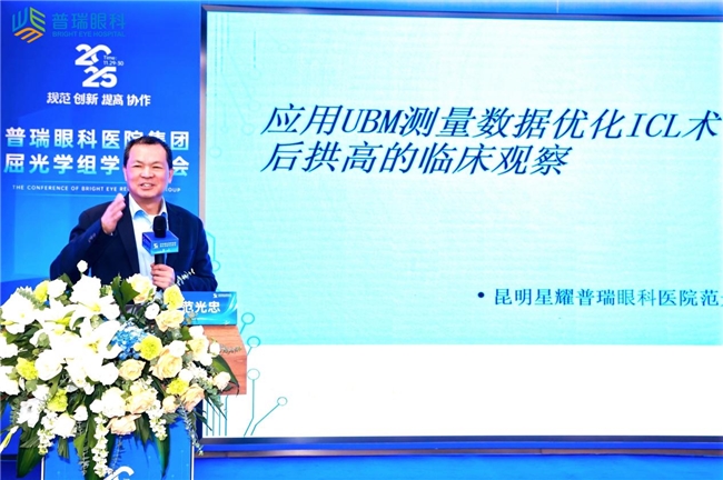 昆明星耀普瑞眼科医院范光忠院长分享了《应用UBM测量数据优化 ICL术后拱高的临床观察》。他通过超500只眼回顾性研究得出,采用UBM精确测量眼内生物参数,是优化ICL术后拱高、保障手术长期安全与效果的结论;并认为基于UBM的个性化晶体选择策略能显著提升理想拱高比例,故应将其作为术前术后评估的“金标准”推广使用。