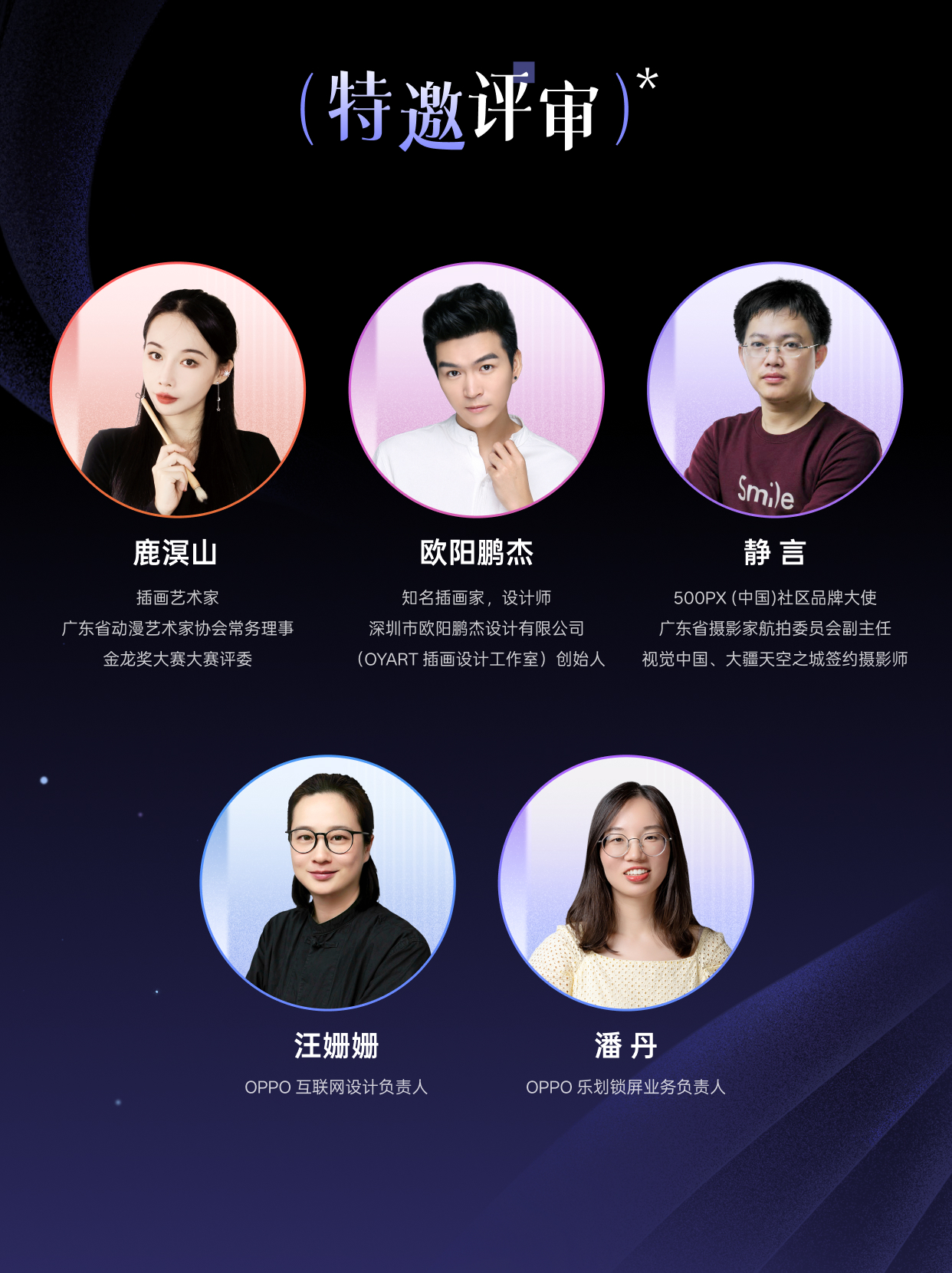 为确保赛事的专业性与公正性,本届大赏将延续高标准的评审机制,邀请插画、摄影领域的资深专家及行业代表组成评审团队,其中包括鹿溟山(插画艺术家)、欧阳鹏杰(知名插画家、设计师)、静言(500px(中国)社区品牌大使)、汪姗姗(OPPO 互联网设计负责人)、潘丹(OPPO 乐划锁屏业务负责人)。评审将从品牌契合度、艺术性、内容规范性与作品连贯性等维度进行综合考量。