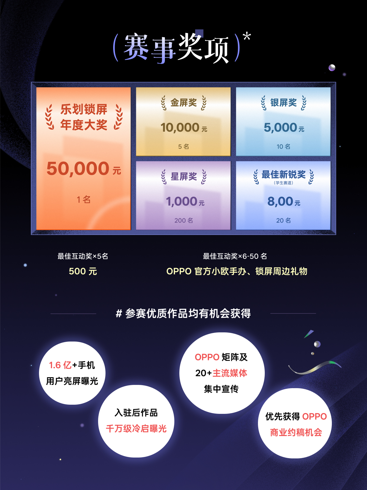 除奖金激励外,获奖作品将在OPPO乐划锁屏的“乐划一签”重点资源位展示,触达超1.6亿日活跃用户。获奖创作者将受邀成为平台“屏主”,不仅享有千万级冷启动流量扶持,更可持续获得内容推荐。此外,获奖创作者还将优先获得OPPO商城、主题商店等生态内平台的商业约稿机会,将创作才华直接对接商业需求,实现个人价值与品牌影响力的双重提升。