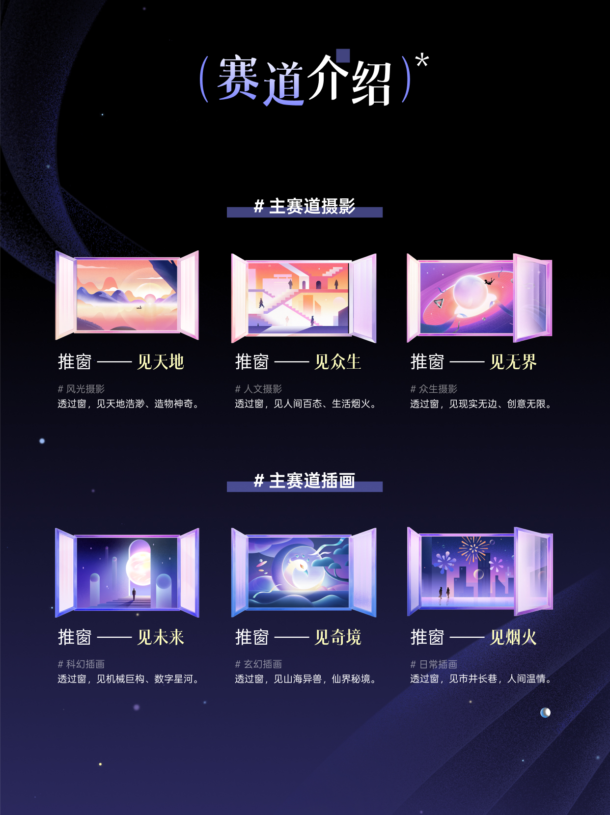 “推「窗」时刻”寓意现实与想象的交汇,也是创作者与世界的对视起点。本届大赏以摄影与插画双赛道,以多元主题引导创作方向。