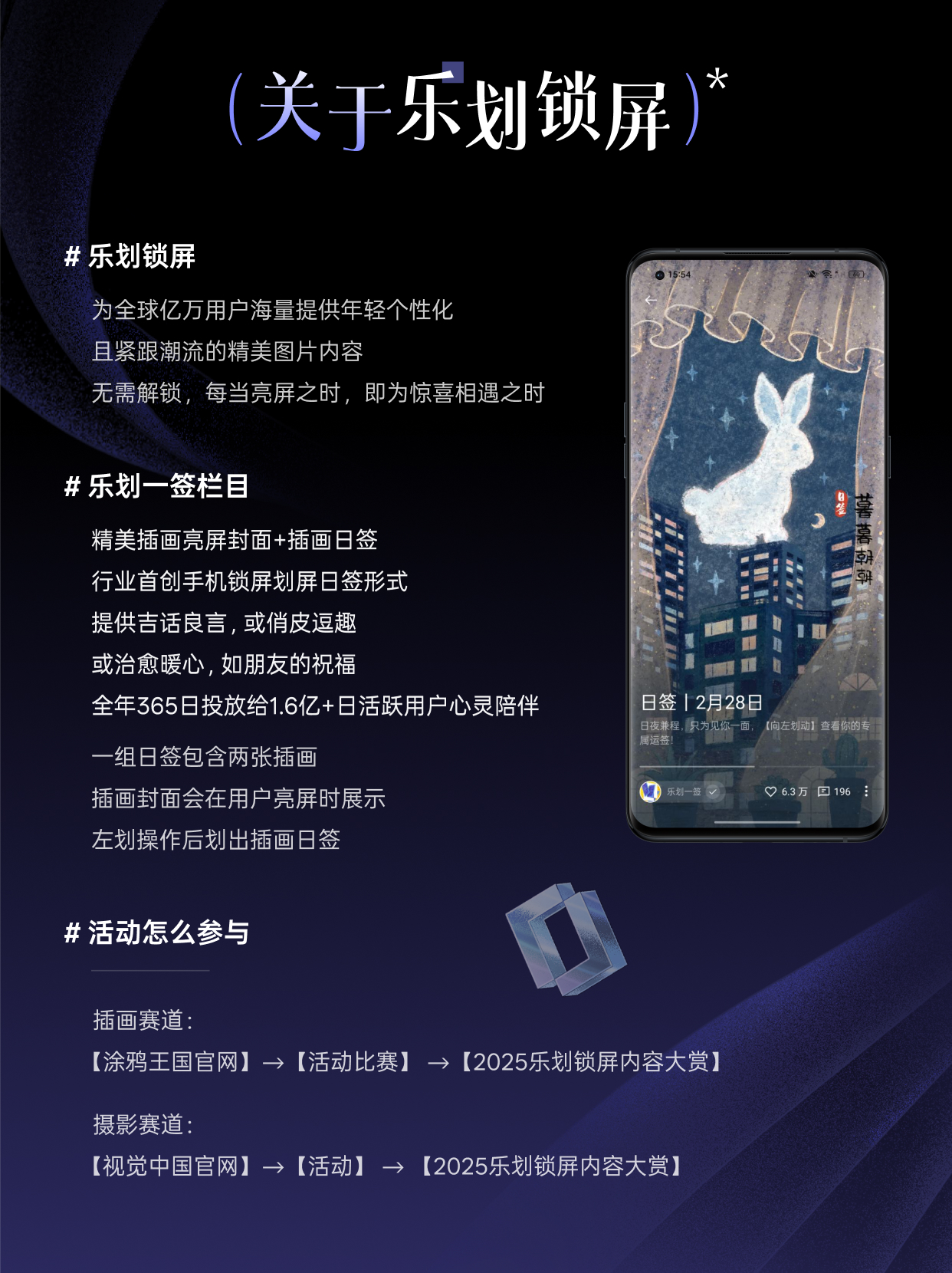 目前,2025乐划锁屏内容大赏征集通道已在涂鸦王国、视觉中国500px官网同步开启,赛事旨在汇聚优质视觉创作,共同打造更具美学价值与情感共鸣的锁屏内容体验。