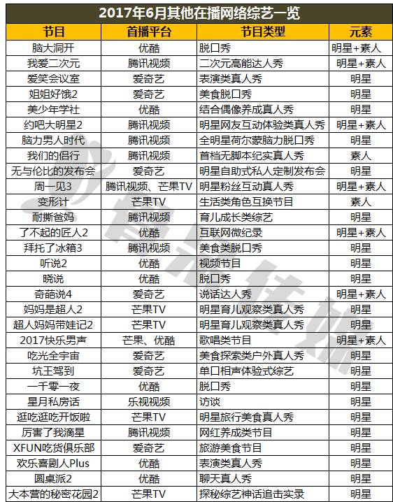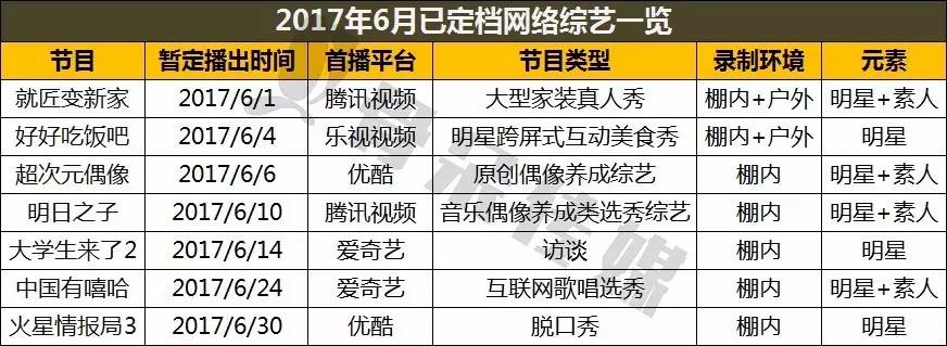 另外,6月份新开播的网综均为棚内综艺,而且原创度极高,除《大学生来了》和《火星情报局》外,其他均为原创的新综艺。腾讯视频的《就匠变新家》和乐视视频的《好好吃饭吧》都是慢节奏小众综艺,夏天太热,网综需要这样的“清流”解解暑。