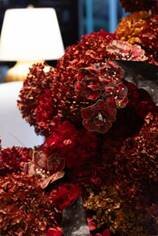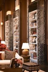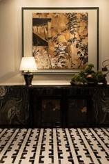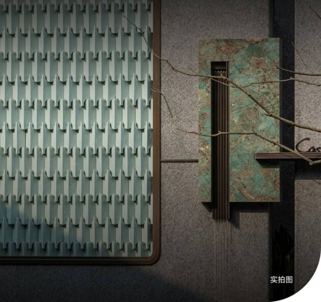 景墙一侧的黄金比例处,“石中爱马仕”亚马逊绿奢石与汝窑瓷片景墙珠联璧合,相得益彰。流水、瓷光、奢石、枫影于「藏锦」,共织一席。