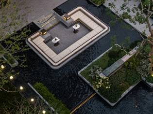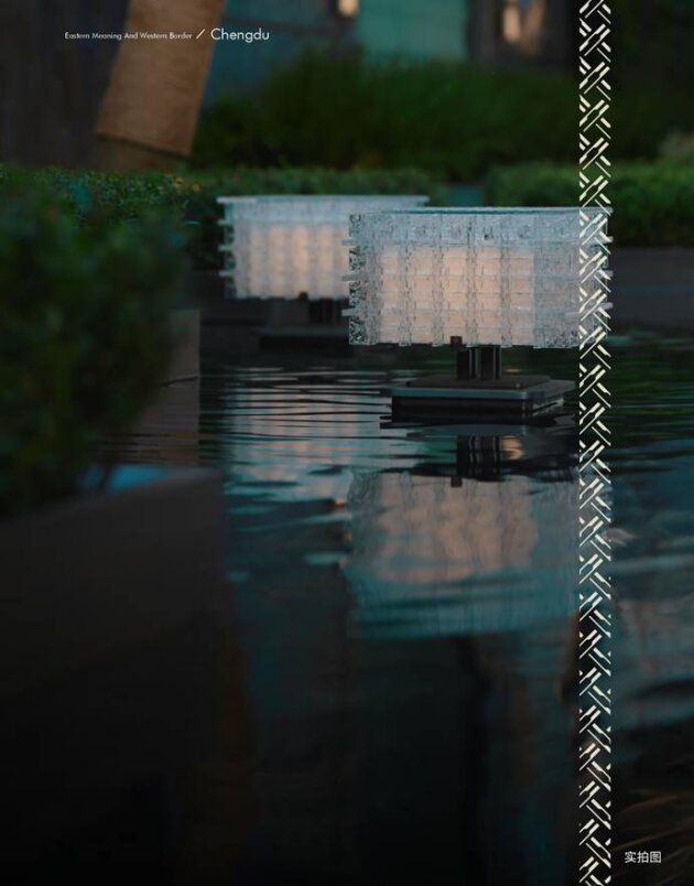 除此之外,团队更巧妙地将竹编纹样融入水景灯饰,演绎巴蜀在地文化;单株造型独特的羽毛枫与孤品级特制天青汝窑瓷片景墙相映成趣,瓷片釉色温润如“雨过天青云破处”,静诉千年文化的当代赋新。