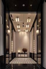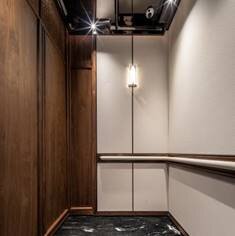 「藏锦」以艺术匠心打造地库归家空间,步步成景。地下归家大堂外延,仿古镜吊顶倒映精神符号,铜条与环氧磨石无缝拼接,搭配阵列式立柱,共筑仪式感归家之路。