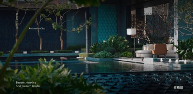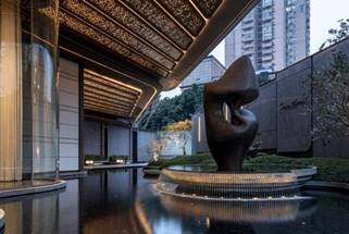 入口处,海蓝宝花岗石整雕而成的波浪板围墙,每一块需耗时一周以上精雕细琢;金属铁艺以类榫卯工艺拼接,焊点隐匿无痕。步入内庭,水景潺湲。水落之处的弧度与声响,都经「藏锦」设计团队反复调试,最终成型。