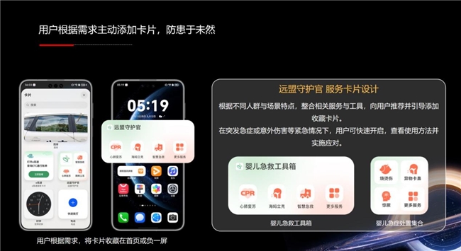智能卡片,精准预判:系统基于用户画像,在手机首页或负一屏自动推送或引导用户收藏服务卡片。如新生儿家庭可收到“婴儿急症处置集合”,危急时刻一键开启应对指南,实现防患于未然。