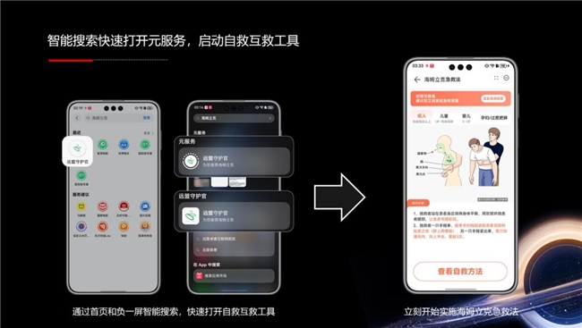 「远盟守护官」元服务正是为此而生。它充分利用华为鸿蒙元服务“秒开直达、纯净直爽、生而可信” 等核心特性,在紧急状况下,用户无需下载应用,即可通过桌面卡片、智能搜索或语音助手“小艺”一键直达服务。无论是需要“心肺复苏急救法”指导,还是立即启动“海姆立克急救法”教学,服务都能瞬间触达,为生命争取宝贵的“黄金4分钟”(《中国公共卫生管理》2021年披露的数据显示,4分钟内开始心肺复苏,生存率可高达49%)。
