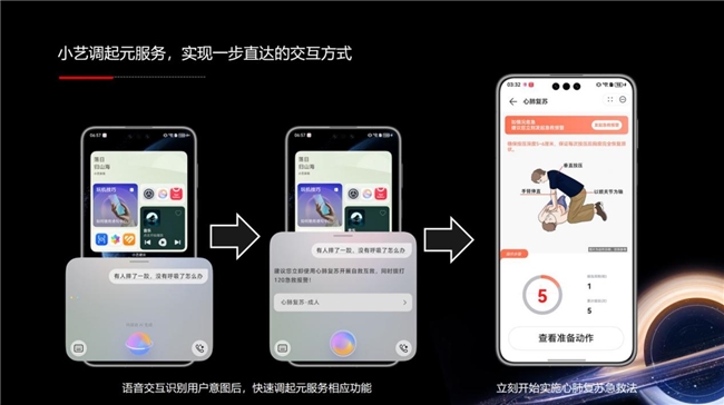 语音交互,一步直达:借助鸿蒙“小艺”语音能力,如用户说出“有人摔了一跤,没有呼吸了怎么办”等指令,系统秒级响应,直接调起对应功能“心肺复苏急救法”,解决慌乱中“找不到、不会用”的难题。