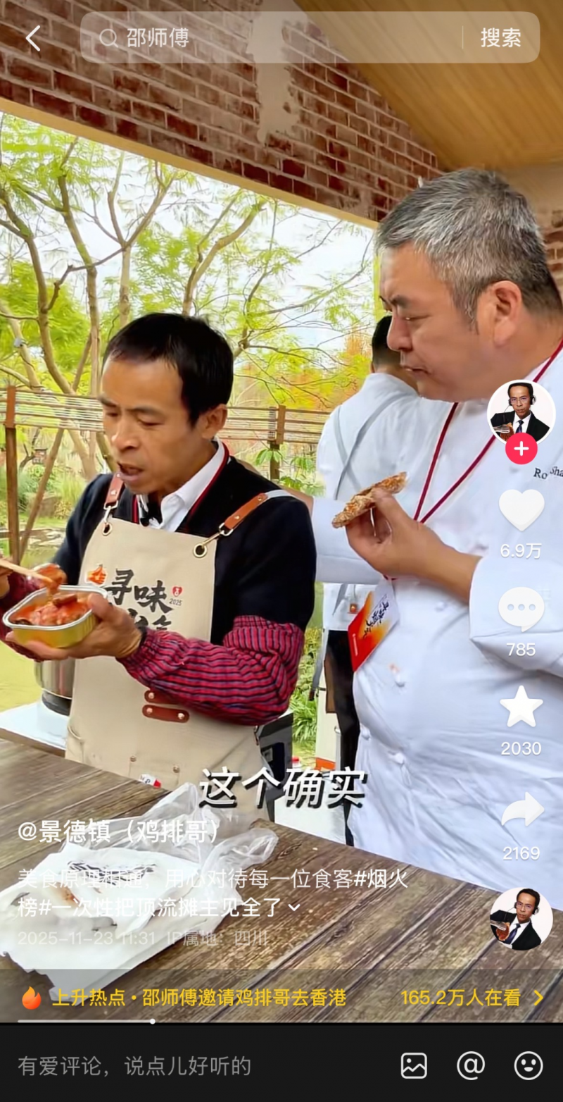 十一月下旬,爆红全网的@景德镇(鸡排哥)现身成都麓客岛,大批明星艺人前往排队试吃,@锅盖wer 等达人更是在摊位前边吃鸡排边整活,连《一饭封神》里的米其林大厨邵师傅也在场尝起了鸡排,还邀请鸡排哥去香港交流。