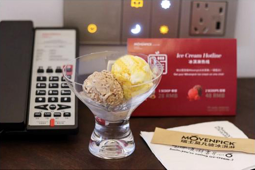 而品牌标志性的24小时冰淇淋热线,更是将甜蜜便捷拉满——无需出门,只需一通电话,定制款的瑞士「国宝级」Mövenpick冰淇淋便可即刻送达客房。