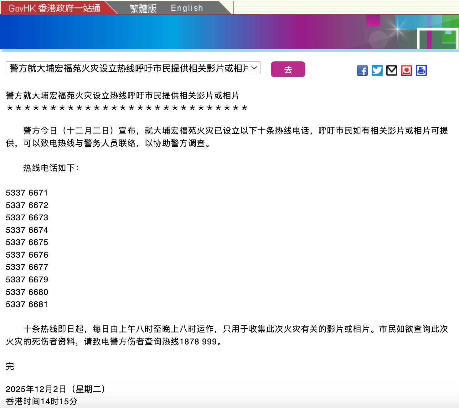 据港府新闻公报,香港警方今日(12月2日)宣布,就大埔宏福苑火灾已设立以下十条热线电话,呼吁市民如有相关影片或相片可提供,可以致电热线与警务人员联络,以协助警方调查。