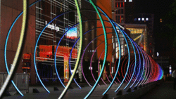 夜幕降临,在成都市中心的红星路步行街上,一条长长的步道铺设在正中央,两旁还吸引了不少驻足围观的市民—步道高出地面约50厘米,每隔数米就有一个拱形装置,远远看去像是一条没有顶的长廊;在每个拱形装置上有多个彩灯发出不同颜色,让这条步行街表现出与众不同的光景。如果仔细观察,你还会发现拱形装置彩灯颜色的变化是有节奏的,从任何一头看去,一个个拱连在一起随着背景音乐的节奏在不停跳动,就形成了一副动感酷炫的画面。