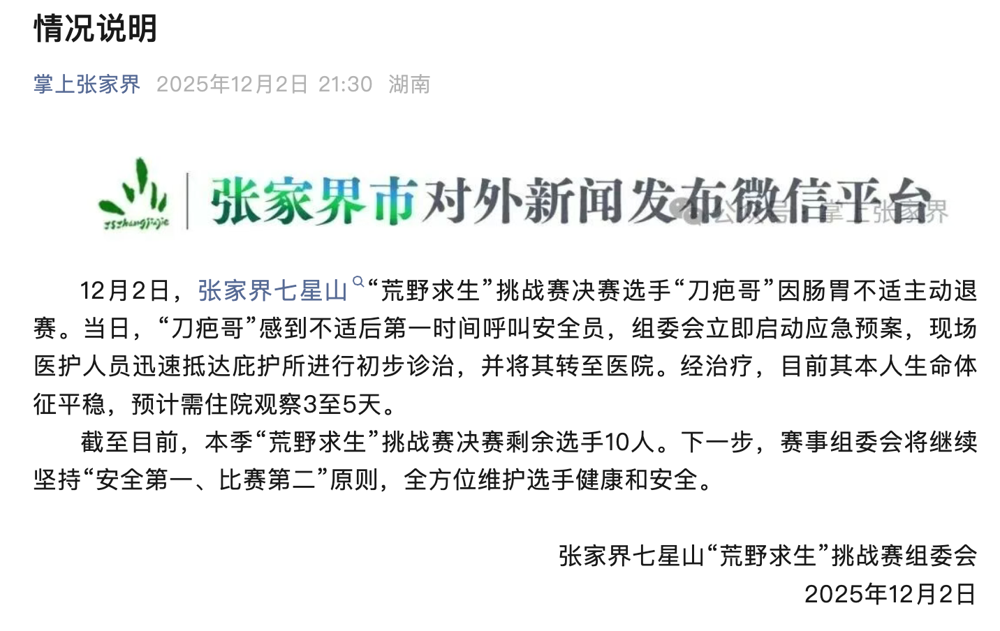 张家界七星山“荒野求生”挑战赛组委会12月2日发布情况说明:12月2日,张家界七星山“荒野求生”挑战赛决赛选手“刀疤哥”因肠胃不适主动退赛。当日,“刀疤哥”感到不适后第一时间呼叫安全员,组委会立即启动应急预案,现场医护人员迅速抵达庇护所进行初步诊治,并将其转至医院。经治疗,目前其本人生命体征平稳,预计需住院观察3至5天。截至目前,本季“荒野求生”挑战赛决赛剩余选手10人。下一步,赛事组委会将继续坚持“安全第一、比赛第二”原则,全方位维护选手健康和安全。